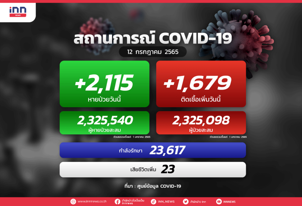 ลดต่อเนื่อง! ป่วยโควิดใหม่ 1,679 ราย เสียชีวิตอีก 23 ราย รักษาหายกลับบ้านได้ลดลง 2,115 ราย เหลือรักษาตัวในโรงพยาบาล 23,617 คน ปอดอักเสบ 788 ราย