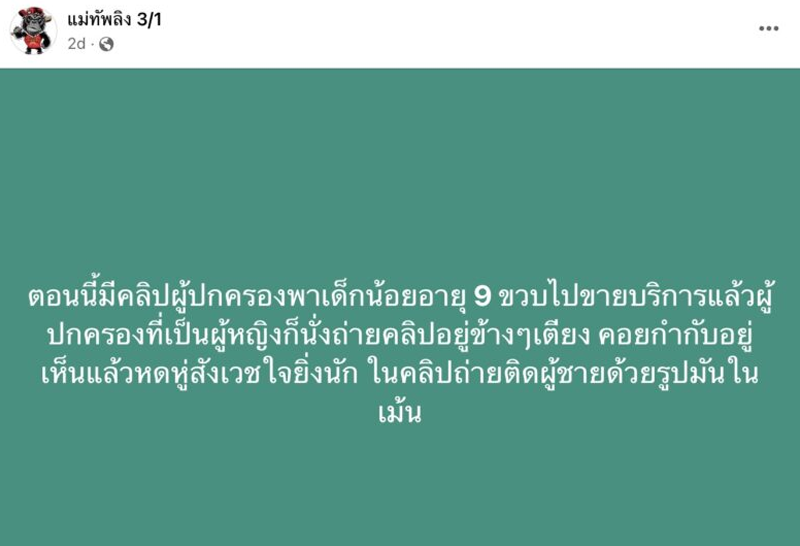 เพจดังแฉแม่พาลูกสาววัย 9 ขวบขายบริการทางเพศย่านนครปฐม พร้อมนั่งถ่ายคลิปให้ปล่อยว่อนกลุ่มโป๊