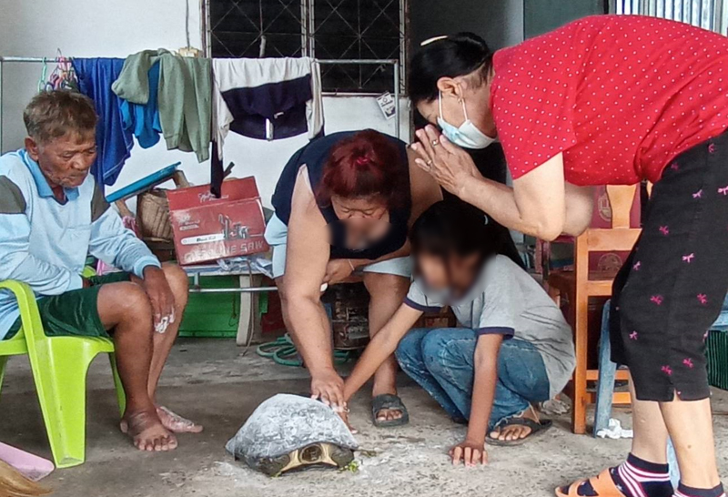 ชาวโคราชตะลึง พบเต่าใหญ่เดินอยู่กลางถนน เชื่อมาให้โชคลาภ ขณะแห่นำแป้งมาถูหาเลขเด็ดตามความเชื่อ
