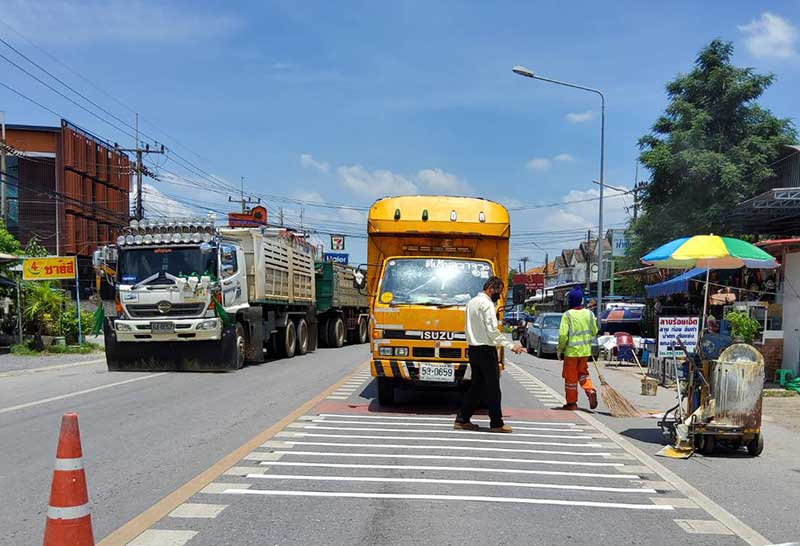 ปทุมธานีทางหลวงชนบทปรับปรุงทางม้าลายบนท้องถนนพร้อมสัญญาณเตือนเขตรร.เจริญดี