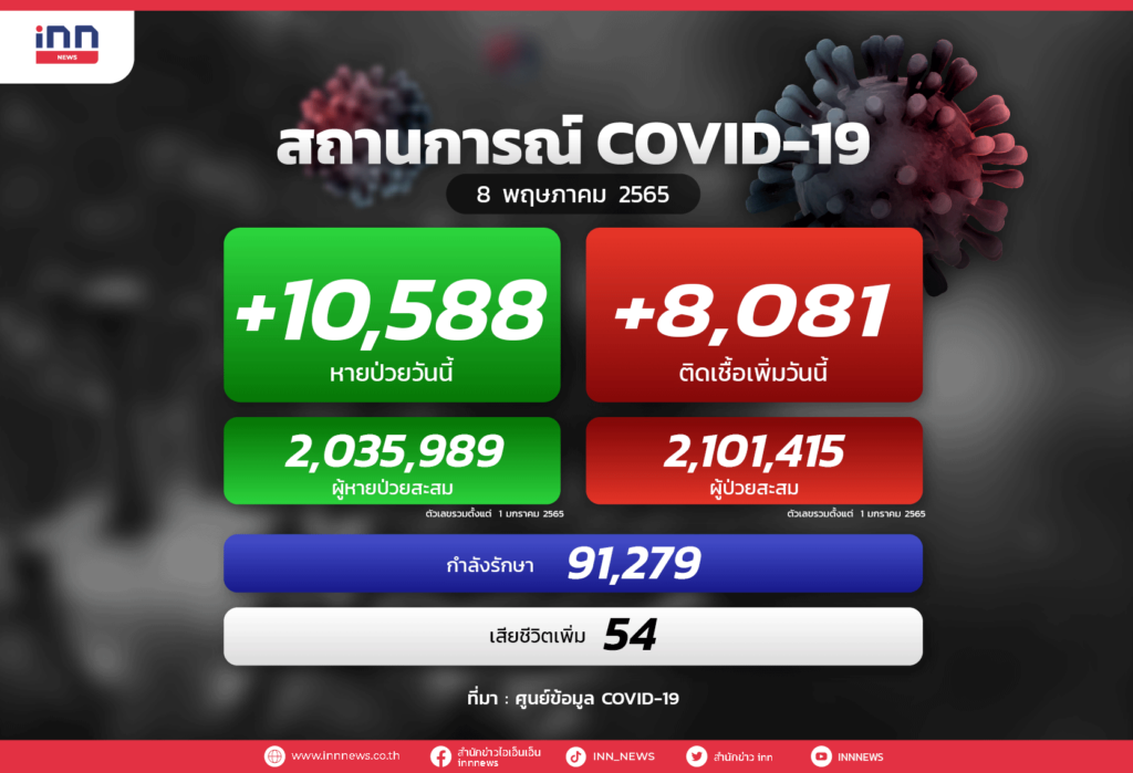 ลดลง!ป่วยโควิดใหม่ 8,081 ราย ต่ำกว่า 1 หมื่น 7 วันติดต่อกัน ขณะเสียชีวิต 54 ราย รักษาหาย 10,588 ราย เหลือรักษาตัวในโรงพยาบาล 91,279 คน