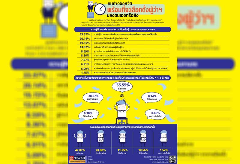 นิด้าโพล 55.55% เห็นด้วยทดลองลต. ผู้ว่าฯจังหวัดใหญ่ๆ