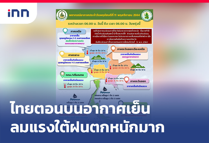 กรมอุตุนิยมวิทยา เผย ไทยตอนบนอากาศเย็นลงมีลมแรง ส่วนภาคใต้ฝนตกหนักถึงหนักมากบางแห่ง ทะเลมีคลื่นสูง