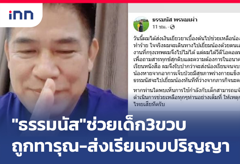 "ธรรมนัส" ส่งเงินช่วยเด็ก3ขวบถูกพ่อทารุณ พร้อมวีดีโอคอลให้กำลังใจ รับปากจะส่งเสียให้เรียนจนจบปริญญา ฝากพบเห็นการใช้กำลังกับเด็กแจ้งในเพจทันทีจะเร่งช่วยเหลือ