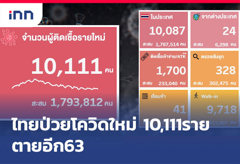 ยังเกินหมื่น!ป่วยโควิดใหม่ 10,111 ราย สะสม 1,793,812 ราย เสียชีวิตอีก 63 รักษาหาย 10,612 ราย เหลือรักษาในรพ.107,226 คน