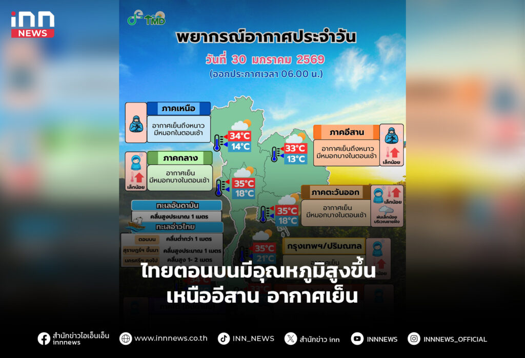 ประเทศไทยตอนบนมีอุณหภูมิสูงขึ้น แต่ภาคเหนือ อีสาน ยังมีอากาศเย็น ภาคใต้มีฝนน้อย ทะเลคลื่นสูง 1-2 เมตร