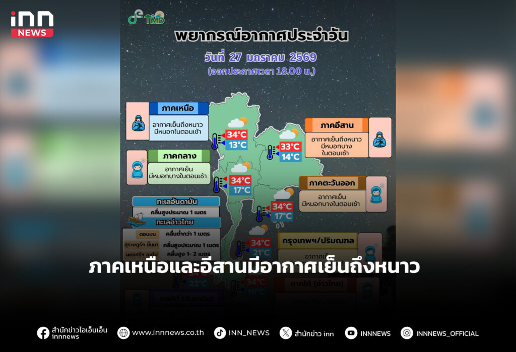อุตุฯ เผย ภาคเหนือและอีสานมีอากาศเย็นถึงหนาว ภาคใต้มีฝนฟ้าคะนองบางแห่ง ทะเลคลื่นสูง 1-2 เมตร