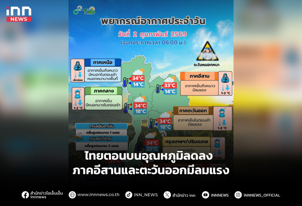 ประเทศไทยตอนบนอุณหภูมิลดลง ภาคอีสานและตะวันออกมีลมแรง ภาคใต้ยังคงมีฝนฟ้าคะนองบางแห่ง ทะเลคลื่นสูง 1-2 เมตร