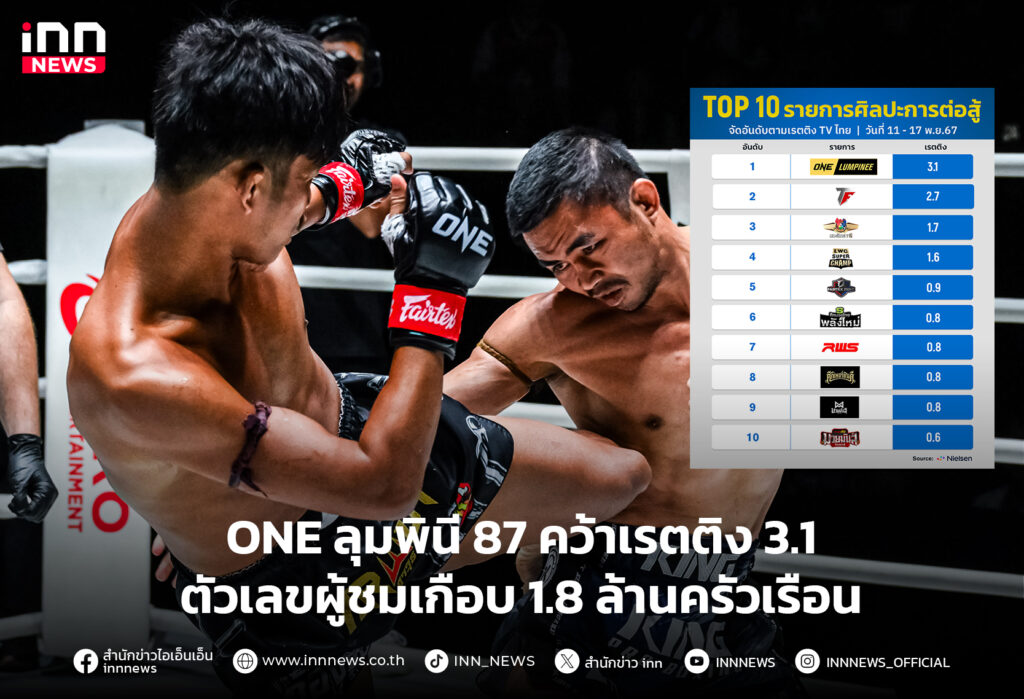 ศึก ONE ลุมพินี 87 นำทีมโดยคู่เอก "ก้องชัย vs โชคปรีชา" คว้าเรตติง 3.1 จากตัวเลขผู้ชมเกือบ 1.8 ล้านครัวเรือน