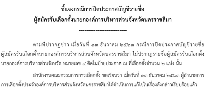 กกต.แจงแก้ไขประกาศรายชื่อผู้สมัครลต.อบจ.แล้ว