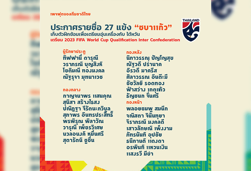 สมาคมกีฬาฟุตบอลแห่งประเทศไทยฯ ประกาศรายชื่อ 27 แข้ง "ชบาแก้ว" อุ่นเครื่องไต้หวันเตรียมทีมลุยเพลย์ออฟบอลโลก