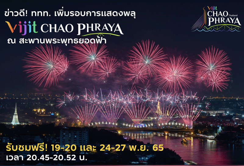 รัฐบาลเชิญชวนประชาชนชมกิจกรรมแสงสี “VIJIT CHAO PHRAYA” 6 จุดริมแม่น้ำเจ้าพระยาจนถึงวันที่ 27 พ.ย. จุดสะพานพระพุทธยอดฟ้าเพิ่มรอบการแสดงพลุ 19-20 ,24-27 พ.ย.