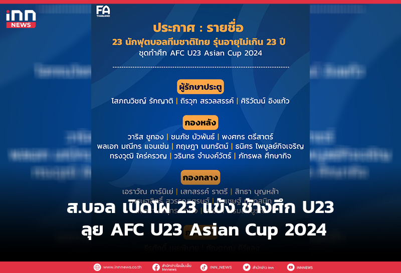 สมาคมกีฬาฟุตบอลแห่งประเทศไทยฯประกาศชื่อ 23 แข้ง ช้างศึก U23 ชุดทำศึก AFC U23 Asian Cup 2024 ที่ กาตาร์
