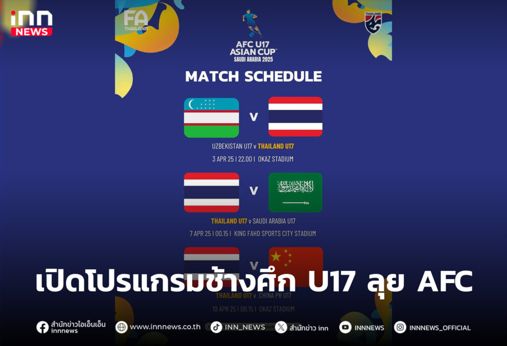 เปิดโปรแกรมฟุตบอลชายทีมชาติไทยรุ่นอายุไม่เกิน 17 ปี สู้ศึก AFC U17 ASIAN CUP Saudi Arabia 2025
