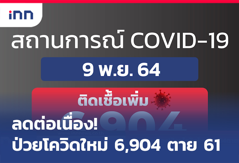 ลดต่อเนื่อง!ป่วยโควิดใหม่6,904 ราย มาจากต่างประเทศ 22 ราย สะสม 1,982,495 ราย ไม่นับATK อีก 1,497 ราย เสียชีวิตเพิ่ม 61 ราย และรักษาหาย 8,024 ราย