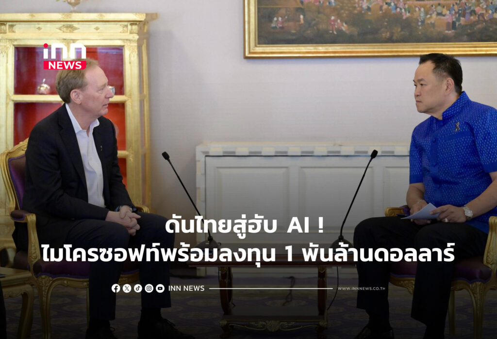ดันไทยสู่ศูนย์กลาง AI ! นายกฯ เผยไมโครซอฟท์พร้อมลงทุน 1 พันล้านดอลลาร์ ยกระดับทักษะคนไทยสนับสนุนบริการรัฐ ลดต้นทุนดิจิทัล