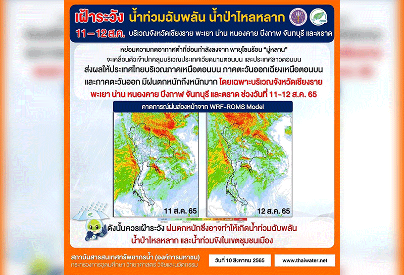 เตือนภัยเฝ้าระวัง 7 จังหวัด น้ำท่วมฉับพลัน น้ำป่าไหลหลาก จากฝนตกหนักถึงหนักมาก 11-12 ส.ค. 65
