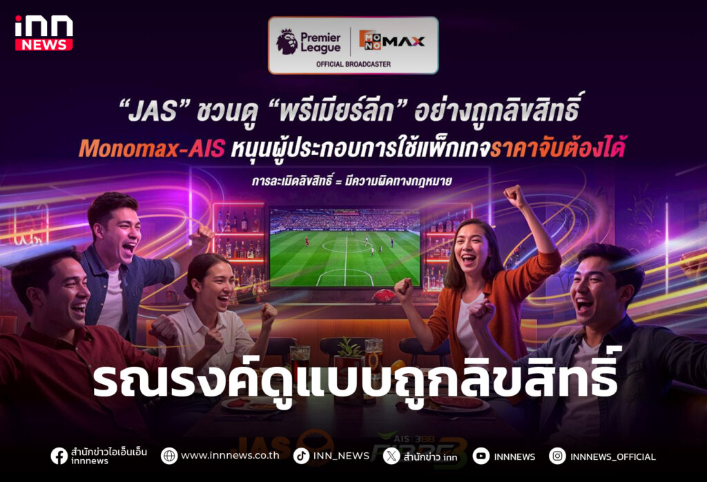 “JAS” รณรงค์ชม “พรีเมียร์ลีก” แบบถูกลิขสิทธิ์“Monomax-AIS” หนุนผู้ประกอบการใช้แพ็กราคาจับต้องได้ เตือนอย่าละเมิดลิขสิทธิ์จะถูกดำเนินคดีตามกฏหมาย