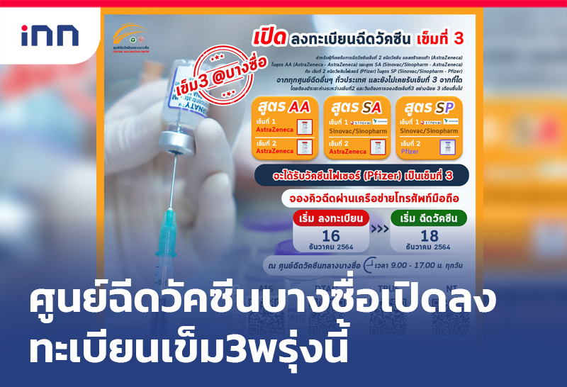 ศูนย์ฉีดวัคซีนกลางบางซื่อเปิดจองคิวฉีดกระตุ้นเข็มที่ 3 ไฟเซอร์ ตั้งแต่วันที่ 16 ธ.ค. 64 เป็นต้นไป สำหรับผู้ที่ฉีด 2 เข็มแรกจากศูนย์อื่น