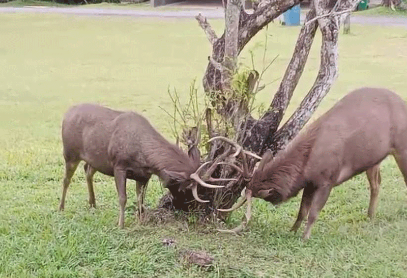 หาดูยาก นทท.บันทึกภาพกวางสู้กันแย่งจ่าฝูง