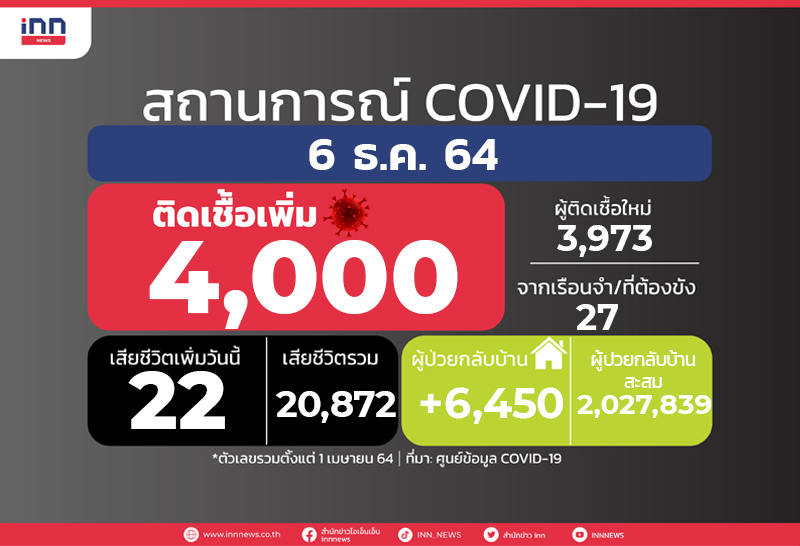 ลดอีก!ป่วยโควิดใหม่ 4,000สะสม 2,145,241ตาย22