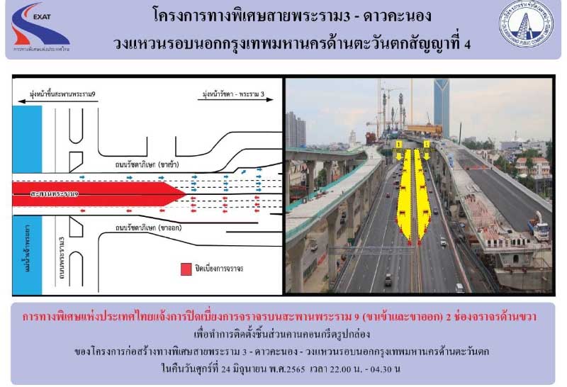 การทางพิเศษแห่งประเทศไทย แจ้งปิดเบี่ยงการจราจรช่องทางขวาบนสะพานพระราม 9 ติดตั้งคานสร้างทางด่วนสายพระราม 3 – ดาวคะนอง - วงแหวนรอบนอก