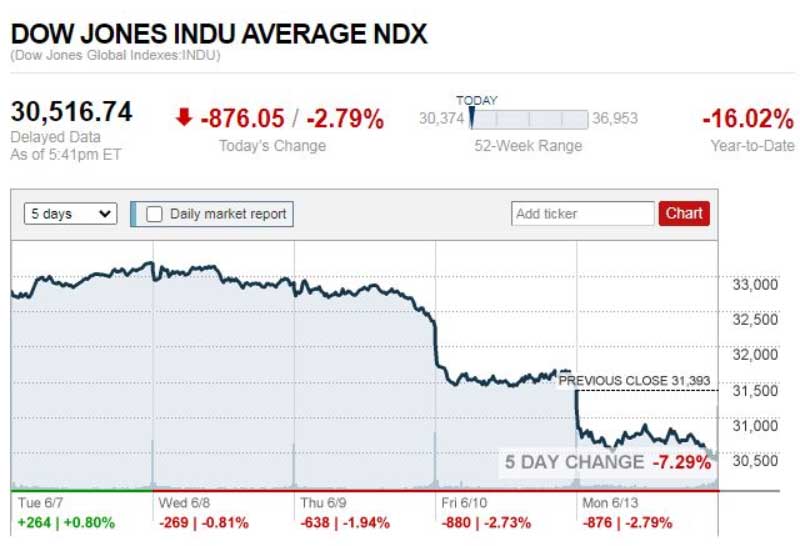 ดาวโจนส์ปิดลบ 876.05 จุด น้ำมันขึ้น ทองลง