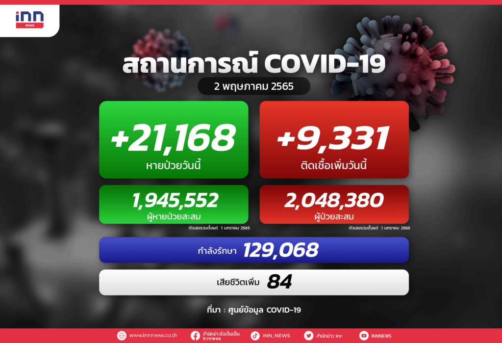 ต่ำกว่าหมื่น! ป่วยโควิดใหม่ 9,331 ราย ขณะเสียชีวิตอีก 84 ราย รักษาหาย 21,168 ราย เหลือรักษาตัวในโรงพยาบาล 129,068 คน ปอดอักเสบ 1,751 ราย