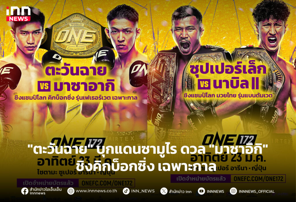 "ตะวันฉาย" บุกดินแดนซามูไร ดวล "มาซาอิกิ" ชิงเข็มขัดโลก ONE คิกบ็อกซิ่ง เฉพาะกาล ผู้ชนะไปเจอ 'ซุปเปอร์บอน' แชมป์โลกตัวจริง