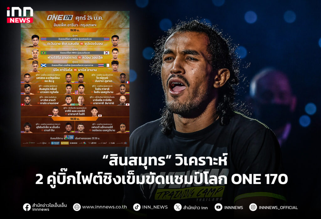 “สินสมุทร กลิ่นมี” นักชกพ่อลูกอ่อน วัย 29 ปี จากชลบุรี ออกโรงวิเคราะห์รูปเกมของสองคู่บิ๊กไฟต์ที่มีเข็มขัดแชมป์โลกเป็นเดิมพัน ในศึก ONE 170 ที่จะเปิดฉากขึ้นอย่างยิ่งใหญ่ ณ อิมแพ็ค อารีนา เมืองทองธานี ในวันศุกร์ที่ 24 ม.ค.นี้ เริ่มคู่แรกเวลา 18.30 น.