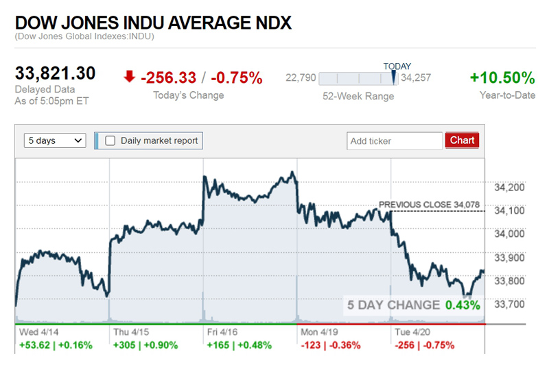 ดาวโจนส์ปิดลบห่วงวิกฤตโควิดทำล็อกดาวน์