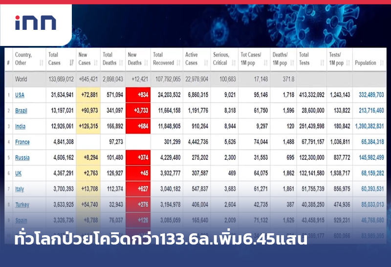 ทั่วโลกป่วยโควิดกว่า 133.6 ล้านคน เพิ่มขึ้น 645,421 คน