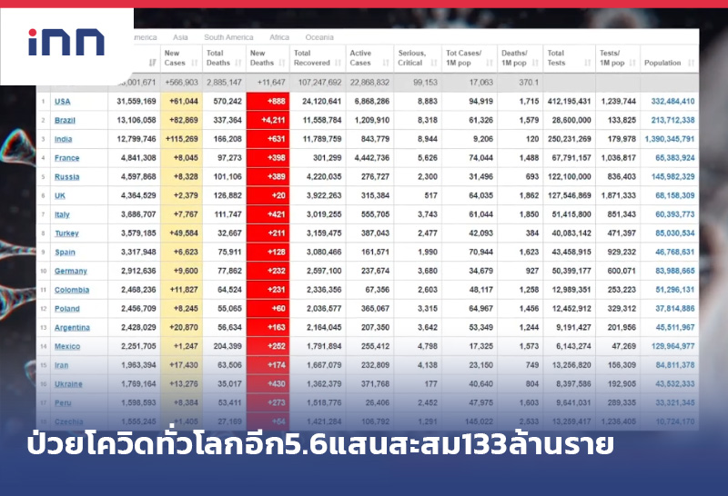 โควิดทั่วโลกสะสมกว่า 133 ล้านราย เพิ่มขึ้น 566,903 ราย