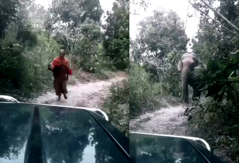หลวงพี่จีวรปลิววิ่งหนีช้างป่า