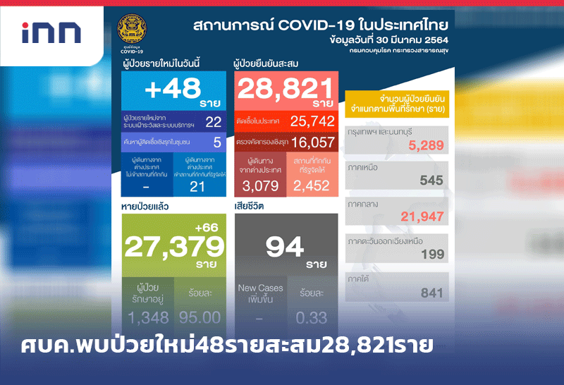 ศบค.พบป่วยใหม่ 48 ราย ติดในประเทศ 27 ราย รวมยอดสะสม 28,821ราย