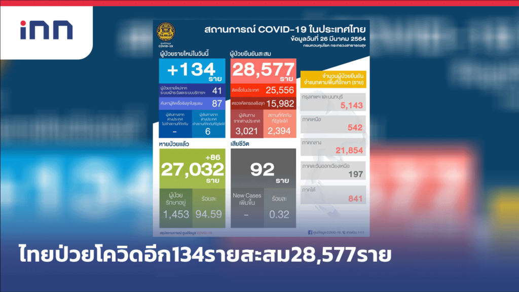 ศบค.เผย ไทยป่วยโควิดเพิ่มอีก 134 ราย ติดในประเทศ 128 ราย สะสม 28,577 ราย