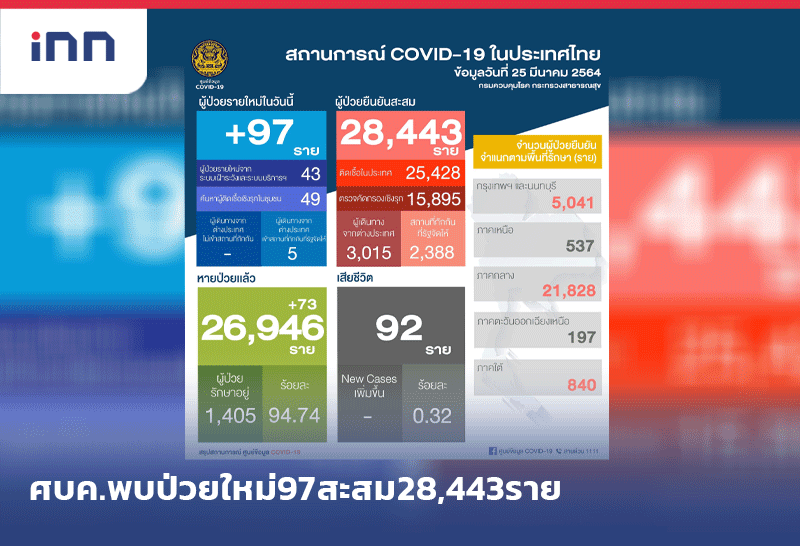 ศบค.พบป่วยใหม่ 97 รวมสะสม 28,443 ราย รักษาหายกลับบ้านแล้ว 26,946 คน