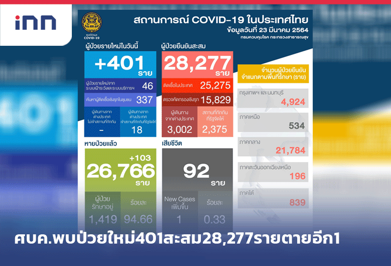 ศบค. เผยไทยป่วยโควิดพุ่ง 401คน ติดในประเทศ383 สะสมรวม 28,277 - ตายอีก 1 รวม 92 ศพ