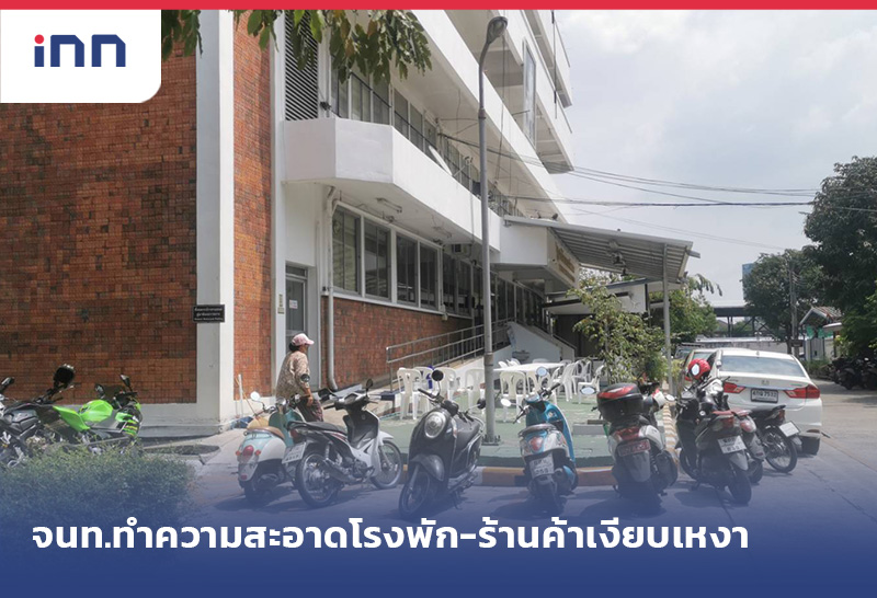เจ้าหน้าที่สวมชุด PPE ทำความสะอาด สน.วังทองหลาง ขณะร้านค้าร้านค่อนข้างเงียบเหงา