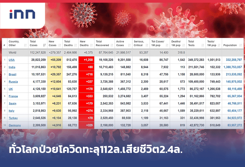 ทั่วโลกป่วยโควิดทะลุ 112 ล้านคน เสียชีวิต 2.4 ล้านคน - สหรัฐฯติดเชื้อกว่า 28.8 ล้านคน