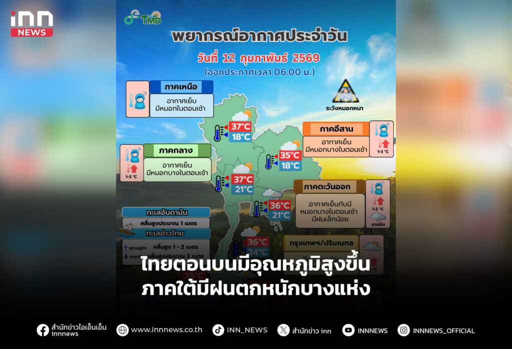ประเทศไทยตอนบนมีอุณหภูมิสูงขึ้น ภาคใต้มีฝนตกหนักบางแห่ง ทะเลคลื่นสูง 1-2 เมตร