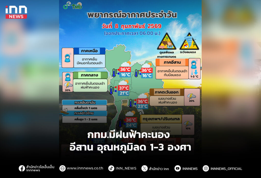 กทม.มีฝนฟ้าคะนอง ส่วนอีสาน อุณหภูมิลด 1-3 องศา