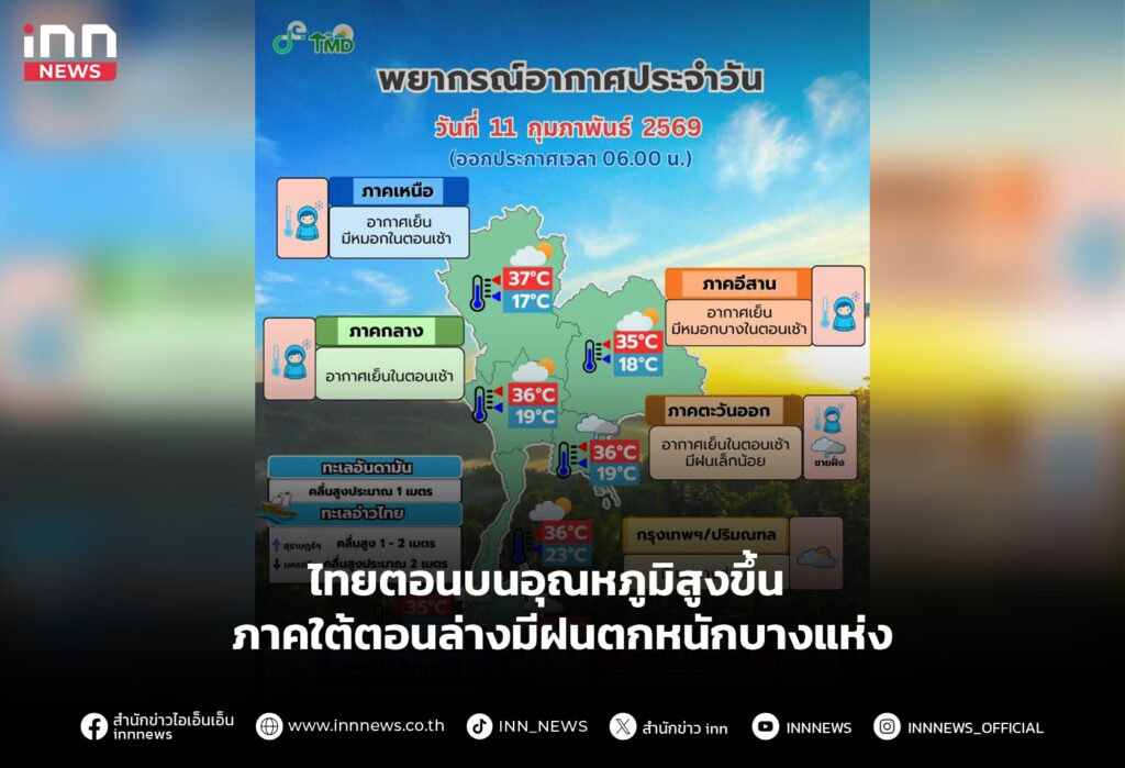 ประเทศไทยตอนบนเริ่มมีอุณหภูมิสูงขึ้น ภาคใต้ตอนล่างมีฝนตกหนักบางแห่ง ทะเลคลื่นสูง 1-2 เมตร