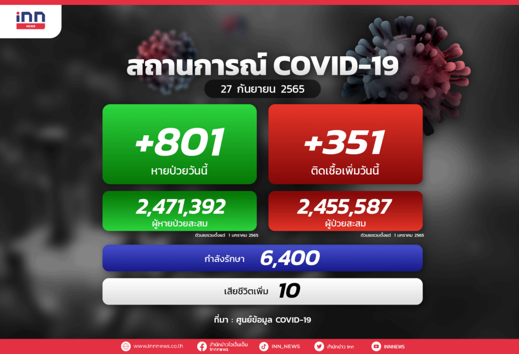 ทรงตัว! ป่วยโควิดใหม่รักษาตัวในโรงพยาบาล 351 ราย เสียชีวิต 10 ราย รักษาหายกลับบ้านได้ 801ราย เหลือรักษาตัว 6,400 คน