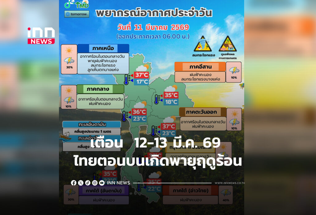 กรมอุตุฯ เตือน 12-13 มี.ค. 69 ประเทศไทยตอนบนเกิดพายุฤดูร้อน ภาคใต้มีฝนฟ้าคะนองทะเลคลื่นสูง 1- 2 เมตร