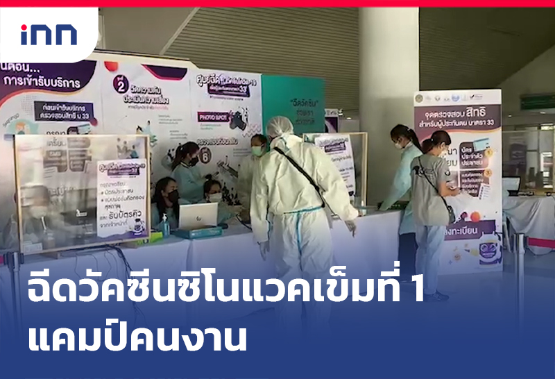 บริษัทก่อสร้าง นำ แรงงานรับวัคซีนซิโนแวค เข็มที่ 1 ณ อาคารกีฬาเวสน์ 1 ศูนย์เยาวชนไทย – ญี่ปุ่นอย่างต่อเนื่อง ขณะเจ้าหน้าที่อำนวยความสะดวก