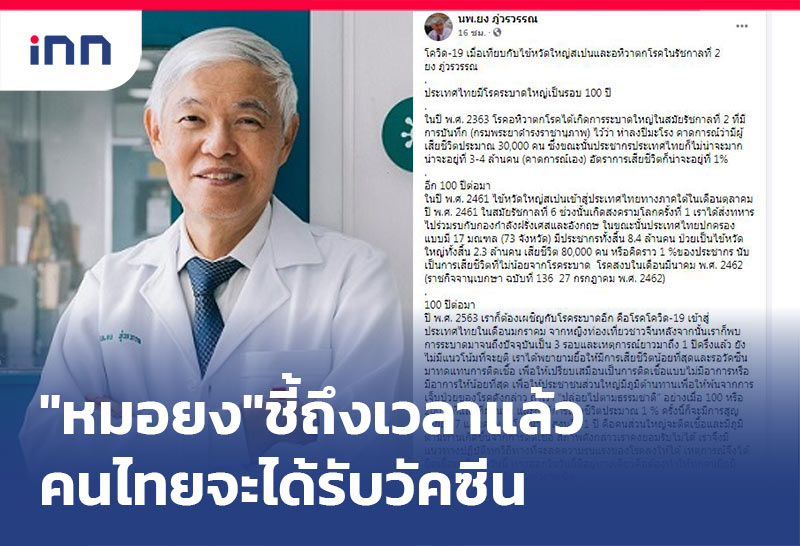 "หมอยง" ชี้ถึงเวลาแล้วที่ประชาชนไทยทุกคนควรจะได้รับวัคซีนเพื่อให้เกิดภูมิต้านทาน