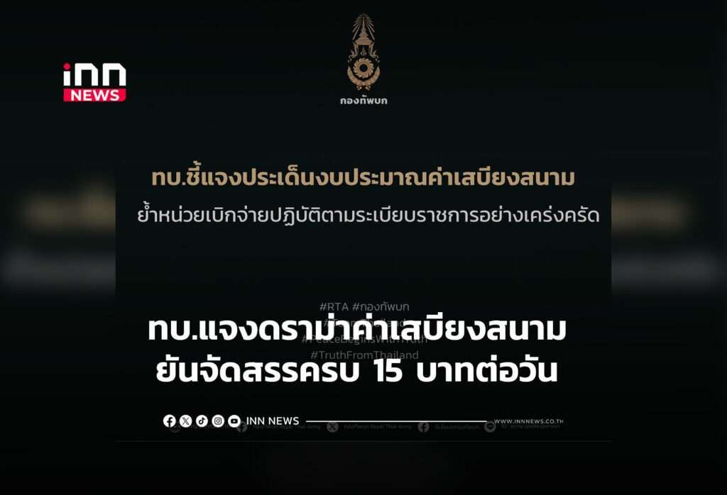 ทบ.แจงดราม่าค่าเสบียงสนาม ยันจัดสรรครบ 15 บาทต่อวัน ชี้บางหน่วยเข้าใจคลาดเคลื่อน จ่ายเงินสดผิดระเบีย