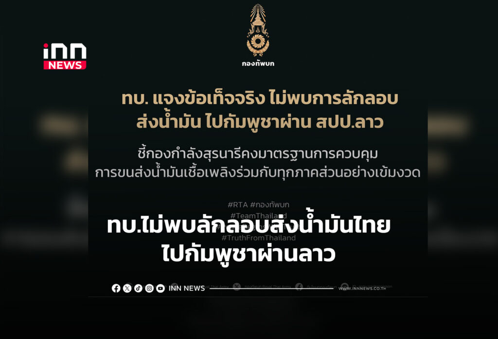 ทบ.แจงข้อเท็จจริง ไม่พบลักลอบส่งน้ำมันไทยไปกัมพูชาผ่านลาว ชี้กองกำลังสุรนารีคงมาตรฐานการควบคุมการขนส่งน้ำมันเชื้อเพลิงร่วมกับทุกภาคส่วนอย่างเข้มงวด