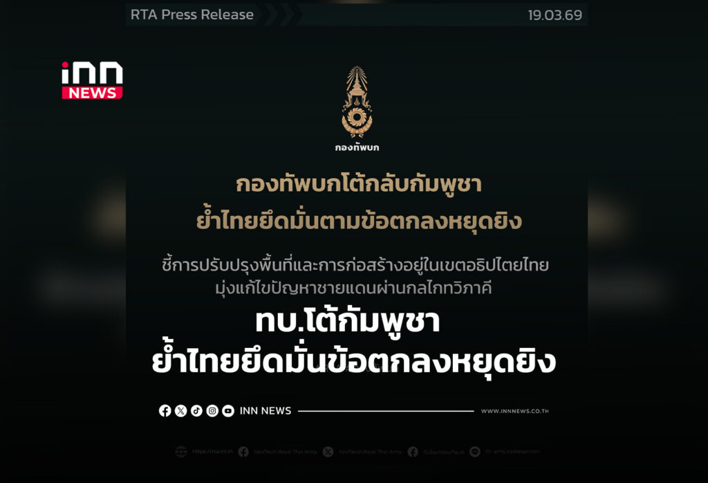 กองทัพบกโต้กลับกัมพูชา ย้ำไทยยึดมั่นตามข้อตกลงหยุดยิง ชี้การปรับปรุงพื้นที่และการก่อสร้างอยู่ในเขตอธิปไตยไทย มุ่งแก้ไขปัญหาชายแดนผ่านกลไกทวิภาคี